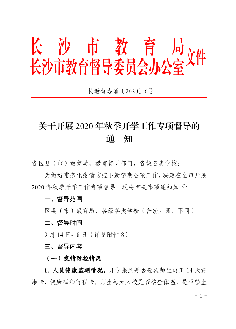 关于开展2020年秋季开学工作专项督导的通知