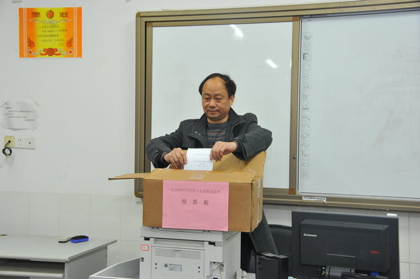 党委书记彭建成亲临第六党支部换届选举现场,并进行投票。