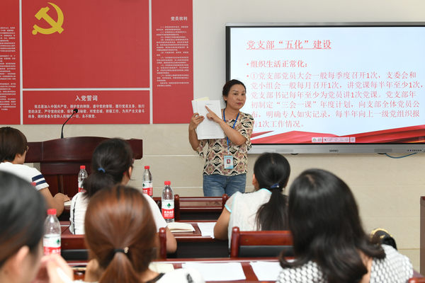 接着党务专干许红萍从《中国共产党章程》、《中国共产党支部工作条例》入手,围绕党支部“五化”建设,从支部设置、组织生活、管理服务、工作制度、阵地建设等五方面,