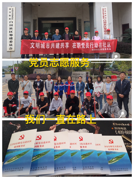 10月13日上午8点,白田社区筹建委员会召集全体在职党员共同开展了一次“文明城市共建共享、在职党员行动在社区”活动。活动内容为白田小区区域内的牛皮癣、白色垃圾的清理。我校党委书记彭建成全程参与志愿服务活动,许国帅、肖俊男、陈婵、池岸枫、刘庆、周旭6位党员老师积极服务,1710、1809、1814、1828班的长住学生也主动参与其中。