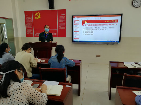 4月28日下午,第四党支部在党建活动室开展了“疫情防控践初心、严峻斗争担使命”主题党日活动,宣传委员陈婵老师组织大家一起深入学习了习总书记《在统筹推进新冠肺炎疫情防控和经济社会发展工作部署会议上的讲话》精神。她号召支部党员要充分发挥先锋模范作用,切实做到“六个带头”,立足工作岗位真抓实干,在防疫中践初心、担使命,积极开展志愿服务与创先争优活动,为学校的疫情防控、学生复学等工作做出贡献。通过此次主题党日活动,支部党员更加明确了当前形势下的工作目标和责任。