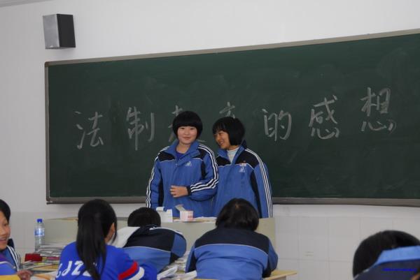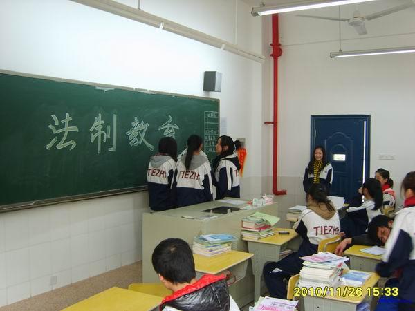 上星期五(2010年11月18日),我校邀请长沙市新开铺劳教所的伍成勇警官为全体学生作了一次生动的法制教育报告会。为深入理解和牢固学生的法制观念,2010年11月26日(星期五)下午班会课时间,学校又在每个班级分别举行了法制教育主题班会课。同学们各出奇招,有的班级组织学生谈个人体会,有的班级组织学生开展讨论,还有的班级则别出心裁的组织学生现场情景模拟,然后引导学生讨论是非曲直。生动活泼地普及了法制观念。(文/栾晓林,图/王煌)