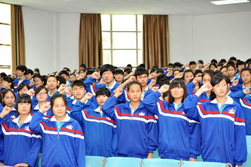 会议在雄壮的国歌声中拉开了序幕。大会首先为2012年上学期团校举行了结业典礼。曾峰科长宣读了本届团校优秀学员名单及入团人数,新加入团组织的116名同学在对口80班毛爱莲同学的领誓下,一起高举右手,在团旗下庄严宣誓。