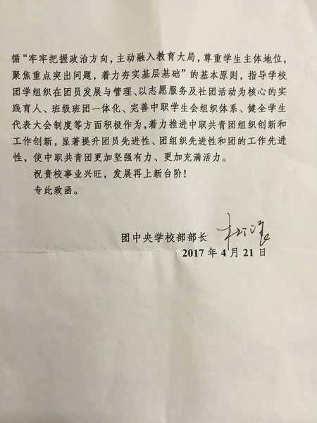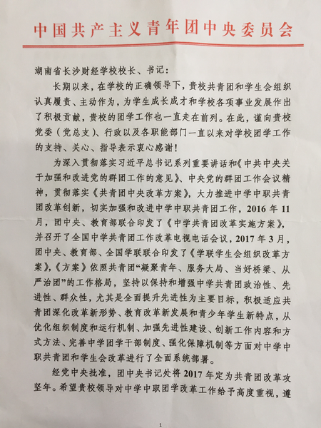5月3日,团中央学校部来函,对一直支持关心我校团学工作的党委、行政以及各职能部门表达了充分的肯定和谢意。