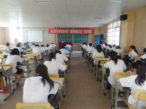 比赛分初赛和复赛,试题由语文教研组杜永微老师制定,初赛由各班派出一名选手参赛,必答30题,在52名参赛选手中角逐出11名同学进入复赛,复赛分三轮:必答题、抢答题和风险题,在班主任的高度重视下,组织本班同学学习湖湘民俗文化知识,在比赛中,选手们表现积极,用扎实的文化知识相互角逐,在亲友团的支持和鼓励下,整个比赛氛围异常激烈,最终由1407班瞿平安夺得冠军。