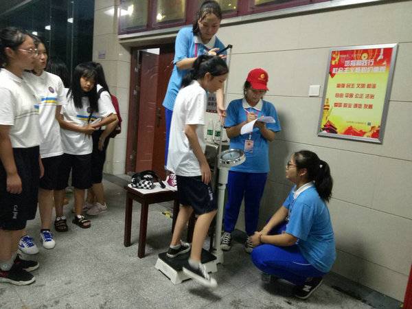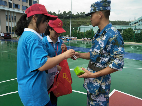 在新生军训期间,军训志愿医疗队在学校医务室和校道旁设立志愿者服务点,协助校医为军训时身体不适的同学提供医疗应急服务;军训志愿卫生队每天晨起清扫军训场上的垃圾,为新生军训提供干净整洁的环境;军训志愿后勤队及时为承训的教官、下班的老师提供用水及降暑降温的药品;军训志愿体测队帮助测量、记录成绩、坚守岗位,为新生的体质测试默默服务,全力以赴。志愿者们在新生、教官休息的时候递上一口凉茶,在新生体力不支的时候送上一份关怀,并及时联系校医予以护理,为新生军训提供了强有力的后勤保障。