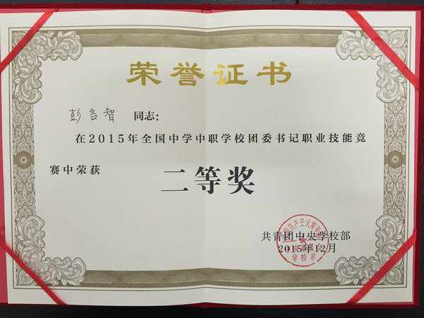 为深入学习贯彻中央党的群团工作会议精神,认真贯彻落实团十七届四中全会精神和学校共青团2015年工作部署,努力提升中学、中职团委书记的综合素质能力和岗位技能,12月17至21日,全国中学、中职团委书记培训班暨职业技能竞赛在北京中国共产主义青年团中央团校举行,我校团委彭言智书记参加培训顺利结业并荣获技能竞赛二等奖。