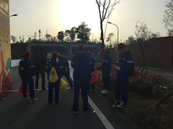 活动当日早上6:00,由团委书记陈旭宇带队,参与活动的8名志愿者在校门口集结完毕,乘坐校车出发前往西湖公园。本次马拉松的首发站是从河西王府井出发跑向长沙西湖公园,我校志愿者承担终点裁判服务工作。在终点负责人的安排下,志愿者分别负责分道指挥、终点计时、成绩记录等裁判工作。简单的培训动员后,志愿者积极投入到裁判工作中,小红帽,蓝校服,灿烂的笑容,礼貌的问候,志愿者大方得体的形象得到了在场人员的一致认同。整个活动过程,志愿者们表现出良好的团队意识和服务意识,在做好自己的任务后,主动地协助其他志愿者,在运动员到达终点后热情的给予帮助。