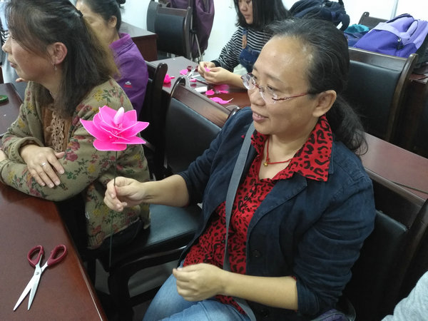 得知要上手工制作课,居民们早早就来到了社区等待。当老师在讲解制作方法的时候,他们都聚精会神地听,再认真地按照老师示范的方法,开始自己动手制作。欢乐的时间总是过得很快!课程结束时,学员们心满意足地看着自己做好的花朵和灯笼,都非常开心。更有一位老太太拿着自己制作的花,再三嘱托,要我们转送给我校体艺教研室的徐笑老师,感谢徐老师不辞辛苦地教她们唱歌。