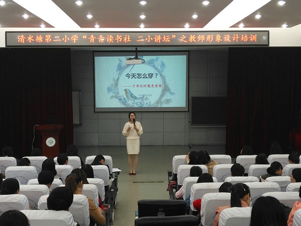 10月24日下午,在清水塘二小的礼堂中,一场主题为“干净比时髦更重要”的教师服饰搭配技巧的讲座在这里进行。担任主讲的是我校形象设计教研室的优秀青年教师何婷。