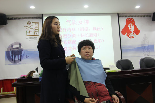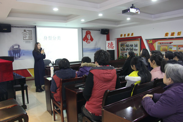 本次授课教师为形象设计教研室的高级服装设计师何婷老师。当日上午,何婷老师一袭深色长款风衣,精心护理的头发和精致娇俏的妆容一下子就吸引了居民的视线。何老师通过几组造型前后的对比,强调服饰搭配对女性气质的影响,这些模特不是比例完美,气质高挑的专业模特,而是普普通通的家庭主妇,或丰腴或削瘦,但是在进行造型设计后,立即变身成为时尚优雅的气质女人。随后,何老师从女性体型、适宜色彩、服装款式等方面讲解女性服饰搭配的技巧,并根据居民的自身情况耐心帮助居民进行体态类型分析和色彩诊断。