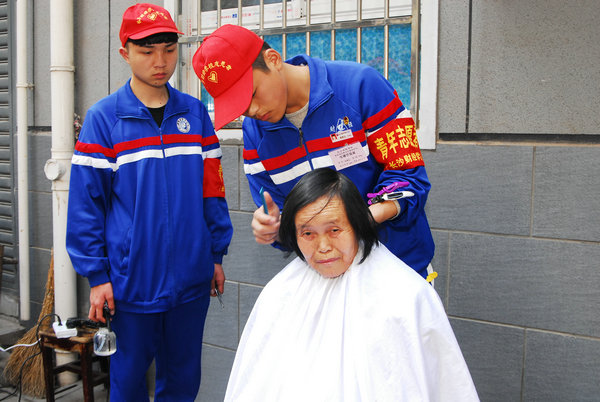 形象设计专业学生在为社区居民剪发