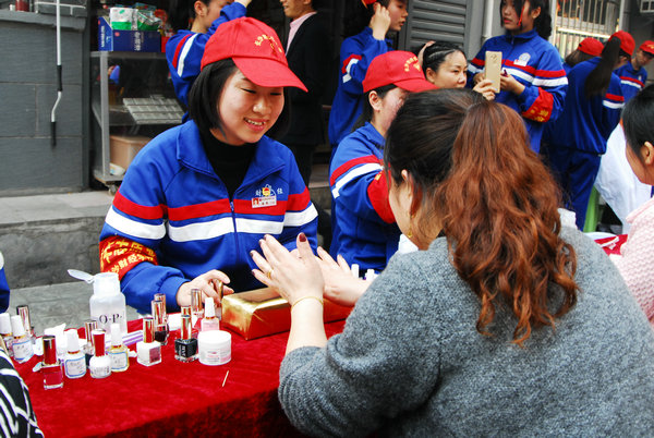 形象设计专业学生在为社区居民美甲