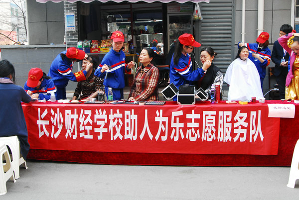 由我校荷花池校区团委组织的二十二名志愿者在团委谢永华老师、形象设计教研室贺佳、吴玉桃、刘伊、莫怕等老师的带领下,组成了“6163银河国际助人为乐志愿服务队”参加了本次活动。其中,来自我校形象设计专业的十二名志愿者分成美发造型、化妆造型和美甲三个小分队,利用扎实的专业技能义务为社区居民提供理发、化妆、美甲等方面的服务,前来接受服务的居民络绎不绝,排队接受服务,并对我校学生的专业技能赞不绝口。我校志愿者服务队真正做到了创新雷锋精神,让雷锋精神与时俱进,做名副其实的“专业知识型雷锋”。