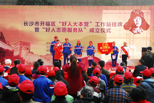 3月2日下午3:00,由长沙市文明办主办,开福区委宣传部、开福区文明办、望麓园街道承办的长沙市开福区“好人大本营”工作站挂牌暨“好人志愿服务队”成立仪式在长沙市开福区望麓园街道荷花池社区道德文化广场隆重举行。