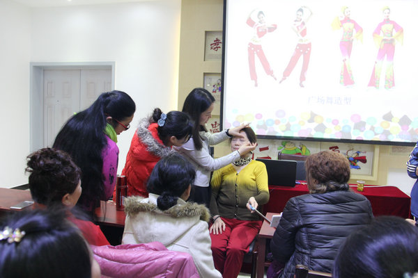 上课伊始,曾老师向学员们讲解了化妆与形象设计的理论知识,介绍了一些常用的化妆工具,并以学员为模特,展示了面部、眼部、唇部修饰的一些基本操作手法。在了解了一系列理论知识后,曾老师还通过提问回答的方式,加深学员们对化妆和造型基础理论知识的理解,并给予回答正确的学员以修饰眉毛的特殊奖励。一问一答间,提高了学员们的学习兴致,被修眉的学员连连称赞曾老师的手法精湛。然后,曾老师要求学员们分组进行练习,虽然部分学员从来没有学过化妆,但是,在曾老师耐心细致的指导下,学员们开始慢慢上手,并且学得有模有样。学员们纷纷笑着说:“学会了舞台妆,以后要上台表演,就不用麻烦别人了。瞧,我画得还不错吧!”