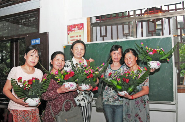 在首次授课现场,来自我校酒店管理与服务教研室的魏虹老师精心准备,不仅运用PPT为在座的学生演示讲解插花的艺术表现、器具与材料、造型与色彩搭配等基本理论知识,还用一双巧手或修剪或弯折将花、草、枝、叶等素材做出各式美观的造型。学员们热情高涨,在魏虹老师耐心的指导下,均完成了自己的首次插花作品。她们喜不自禁,纷纷与作品合照留念,并把作品带走欲装扮家庭或办公室。家住清水塘社区的周阿姨说:“非常高兴和小姐妹们一起参加这样的活动,丰富了我们的业余生活,提高了我们的生活品味。”退休的王老师说“平时我就喜欢种花养花,这次学到插花技巧,以后也能用花来装扮生活,到了我们这个年纪也应该活得美丽,活得优雅。”