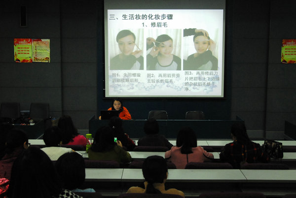 讲座上,曾老师着重介绍了几款适合教师的生活妆,提炼出八个步骤进行了示范,操作性、观摩性极强,轻松愉快中便可以学会。荷花池校区20余名老师到现场观摩学习。课后大家还热情的为做好这次讲座献计献策,力争精益求精。