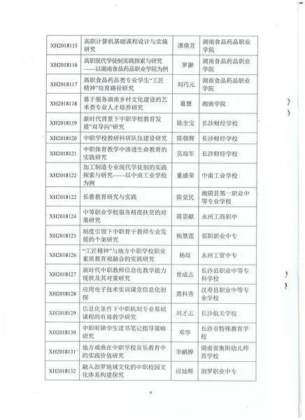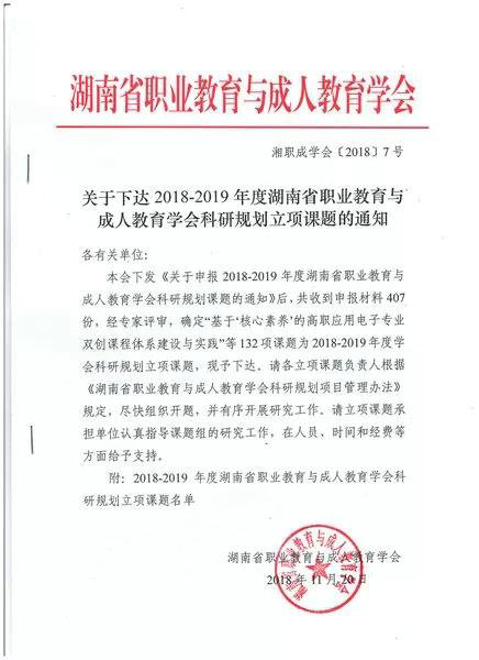 2018年12月,湖南省职业教育和成人教育学会发布的2018--2019年度研究课题申报立项中,共收到全省申报课题407份,经专家评审,最后批准立项132项。其中中职学校仅立项14项,我校成功立项3项。分别是《新时代背景下中职学校教育发展“双导向”研究》(主持人:陈全宝),《中职学校教研科研队伍建设研究》(主持人:陈朝辉),《中职体育教学中渗透生命教育的实践研究》(主持人:吴琼军)。在由长沙市教育科学研究院组织的长沙市教育科学“十二五”规划2018年度立项课题申报中,我校贺泽霖老师主持的《中职学生的自我同一性发展现状及干预研究》已立项。目前,6163银河国际共有18项省级课题、4项市级课题正在研究中。