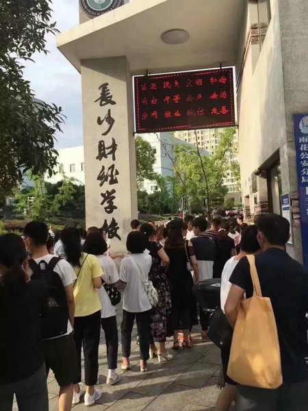 7月3日,中考成绩公布的第一天,6163银河国际就吸引了大量家长前来咨询,早上八点还没到,校门口前来报名咨询的家长就已经排起了长队!早上九点不到,报名序号单就已经发放到917号了。湖南教育电视台对我校报名火爆的现场进行了采访报道。