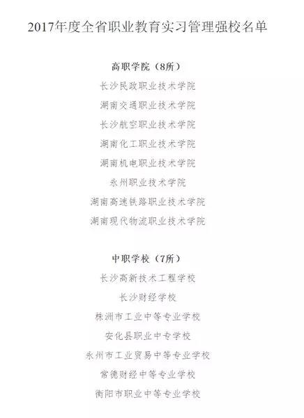 1月9日,湖南省教育厅公布2017年全省职业教育实习管理强校名单(湘教通[2018]13号),我校列为中职学校7强、长沙市2强之一。高度肯定了我校实习管理工作