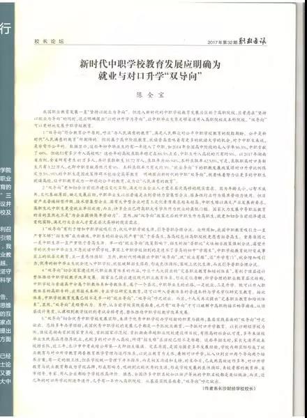 新时代中职学校教育发展“双导向”这个观点,在全国还属率先提出,得到了我国主流职教媒体《职教通讯》杂志的高度肯定!该杂志在2017年第32期(11月中旬刊)卷首栏目“校长论坛”发表陈校长论文予以支持。