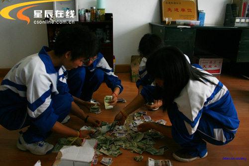 “记者姐姐,这些是我们卖报的钱,因为很多人不相信我们,所以我们希望到报社里打开捐款箱统计一下。”长沙市财经职业中专张松岭校区电子商务96班的谭润泽和他的同学们捧来一个红色的捐款箱,在镜头前手忙脚乱地拆开。