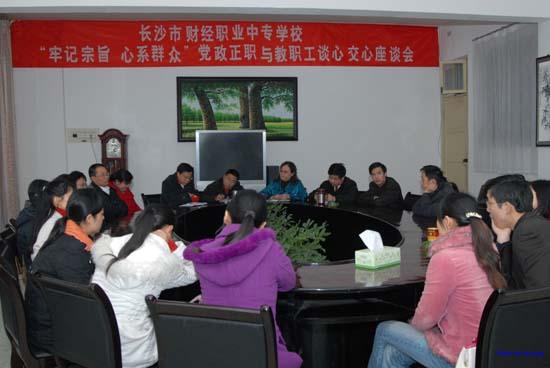 12月10日中午1:00,长沙市财经职业中专学校小会议室里,正在召开“牢记宗旨,心系群众”党政正职与教职员工谈心交心座谈会,学校党委书记黎辉同志、校长肖建军同志以及其他校级班子成员参加了此次座谈会。