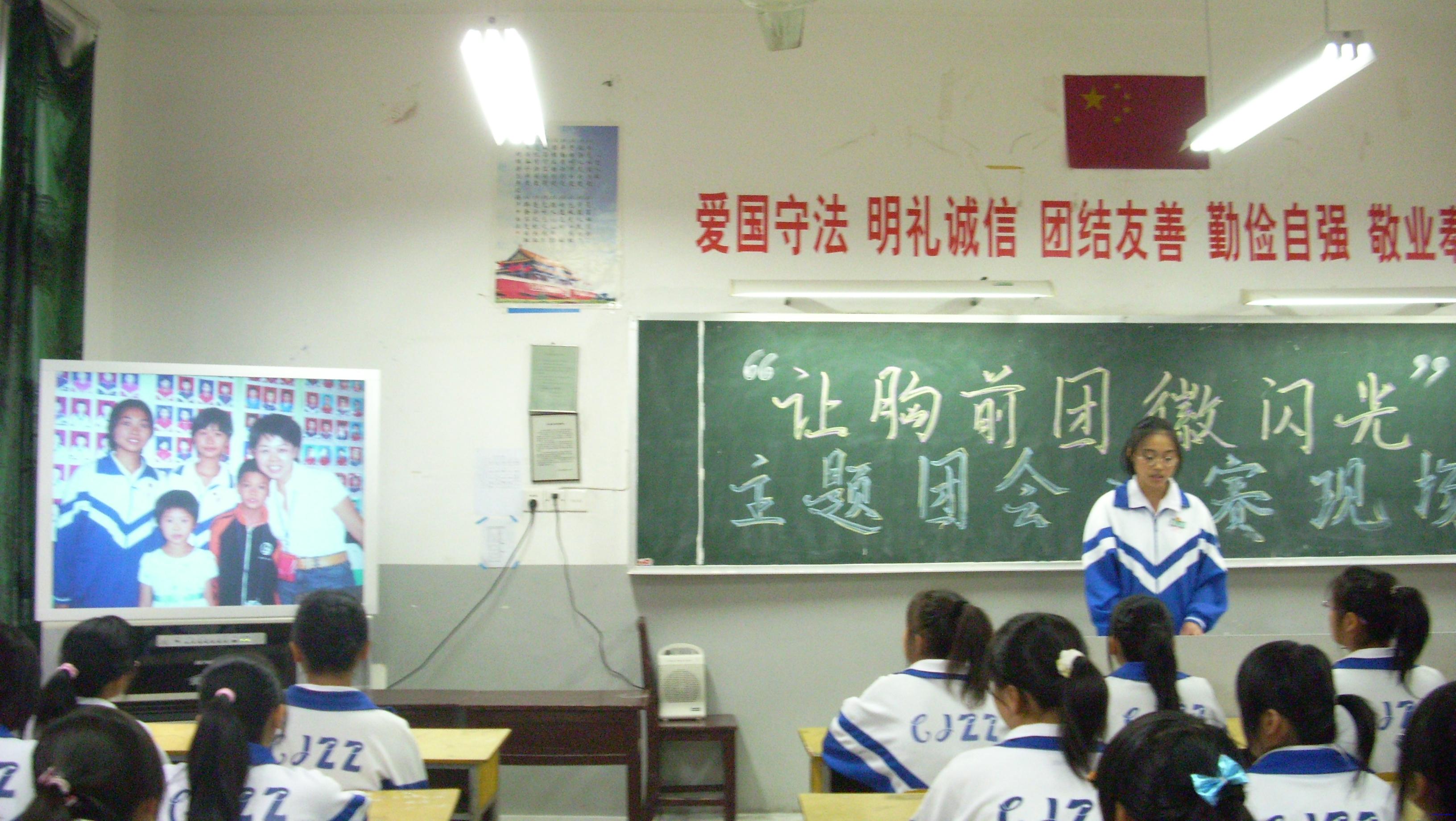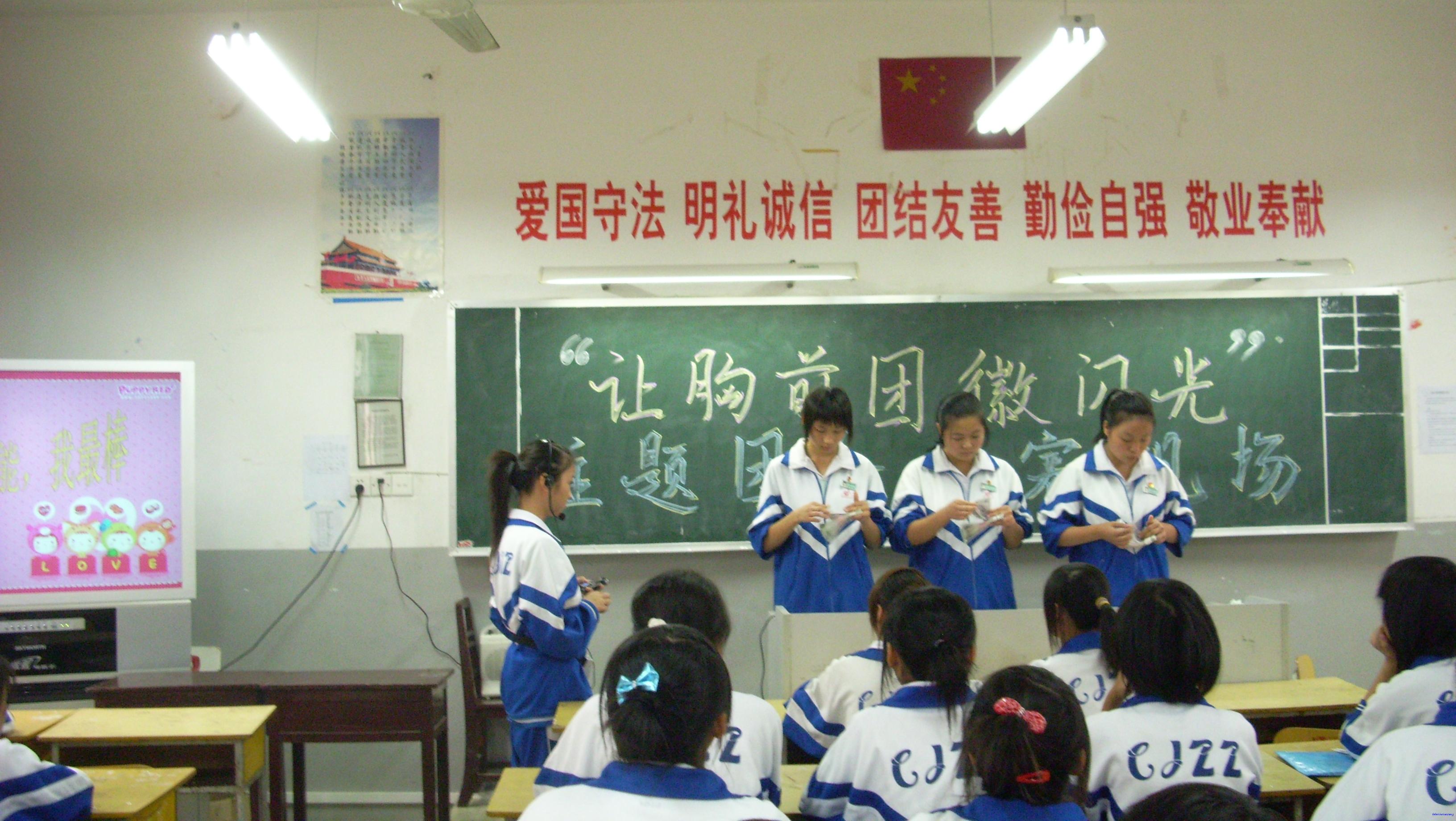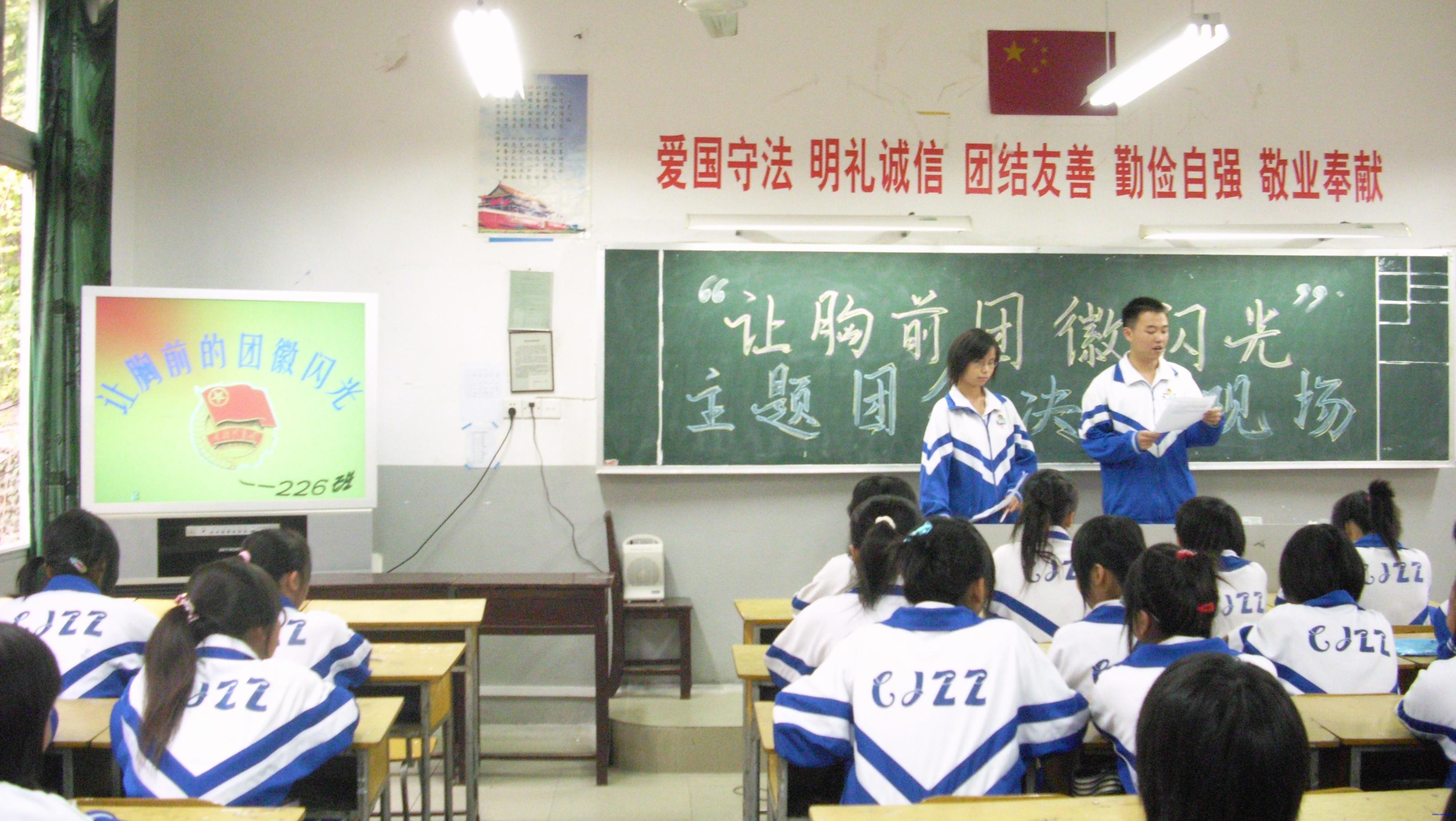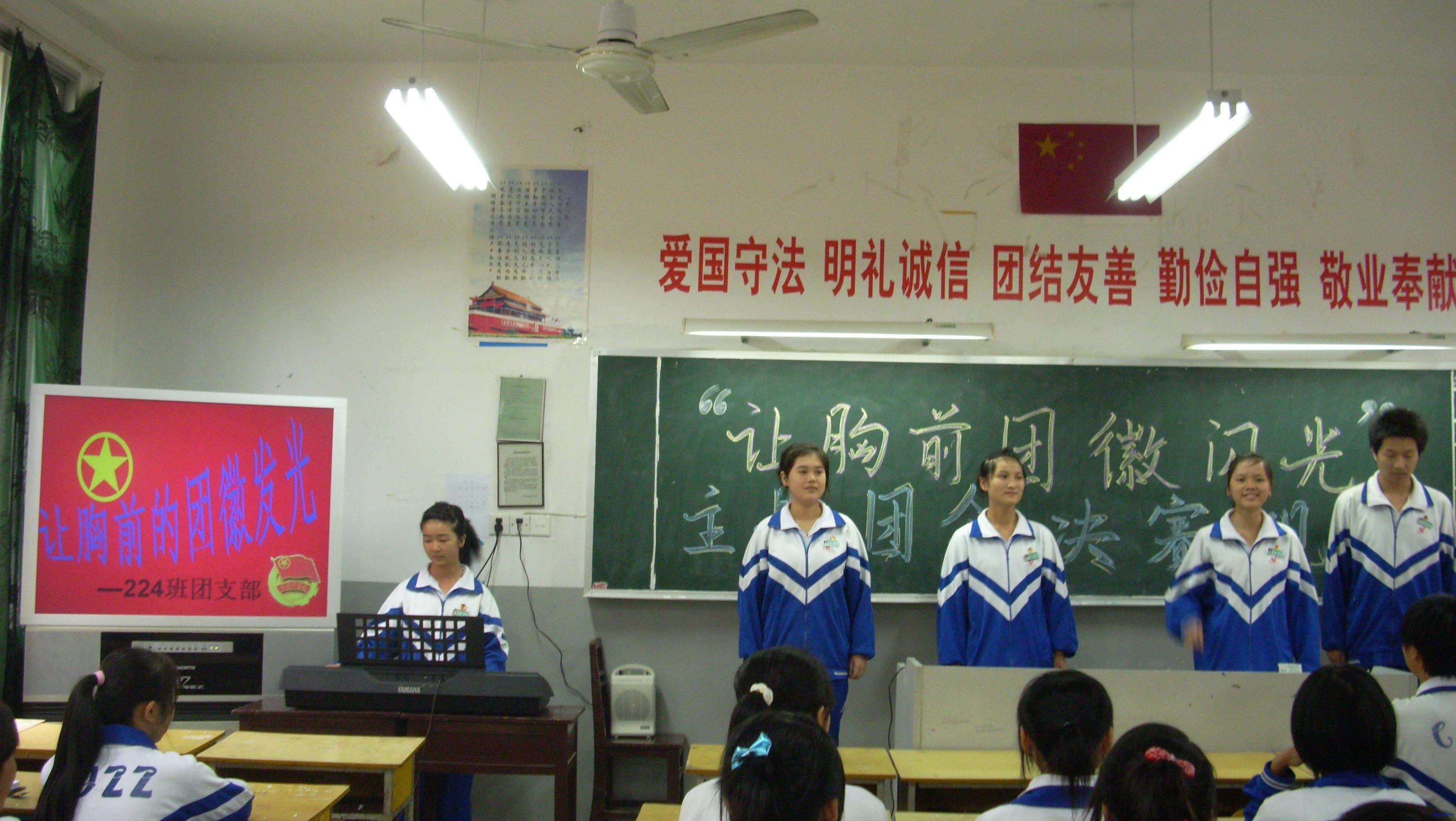 多年来,我校团委在党委的直接领导下,一直坚持不懈地加强团员意识教育,努力提高团员整体素质。今年10月初,在喜迎党的十七大的胜利召开之即,校团委特组织了高二年级团支部开展“让胸前团徽闪光”主题团会的比赛。经过紧张而激烈的为期一周的初赛后,选出了11个班级进入10月21日下午的决赛。