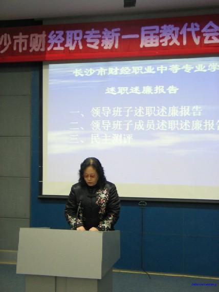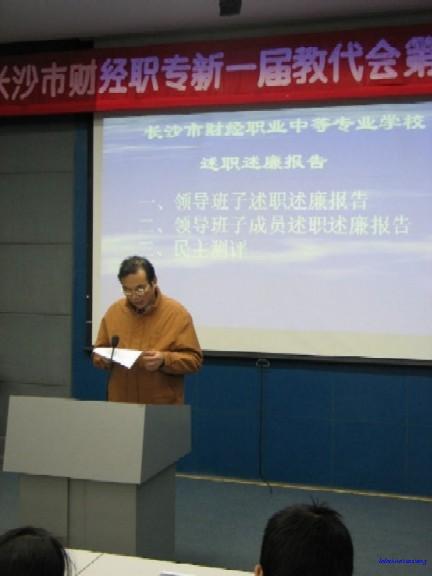 2005年12月24日,长沙市财经职业中等专业学校召开了新一届教代会第二次会议。这次会议的主要内容是听取学校领导班子和班子成员的述职述廉报告,再由市教育局党建处的领导,组织对我们学校的领导班子及成员进行民主测评。