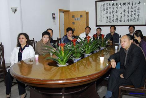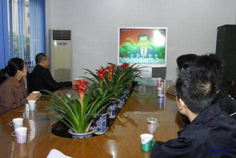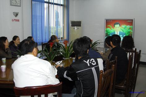 长沙市财经职业中等专业学校会议室,没有课的老师聚集在这里,观看十七大开幕式的直播。老师们听看很认真,时而做一下笔记,会议室里显得既庄严又充满了深厚的学习氛围。