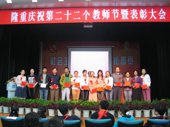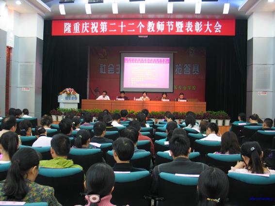 2006年9月10日上午8:30,嘹亮的国歌回荡在长沙财经职业中专学校会议室里,财职全体教职员工欢聚一堂,在这里庆祝第二十二个自己的节日。会上,党委书记黎辉发表了热情洋溢的贺词,回顾了近年来特别是过去的一年里财职取得的辉煌成绩,并高度评价了老师们为学校发展做出的巨大贡献。在发言中,黎书记提出了以“艰苦奋斗、乐于奉献的创业精神,善于探索、不断开拓的创新精神,忠于职守、勤奋工作的求实精神,团结合作、上下同心的团队精神”为内容的财职精神,号召大家学习先进,勤奋工作,将财职精神发扬光大,为争创全国一流品牌职校而努力。