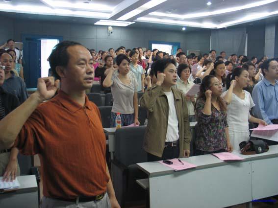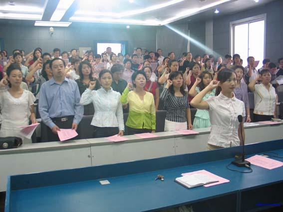 9月19日,该校“知荣辱、强师德,铸师魂”系列活动在多媒体报告厅继续开展。这次全体教职工的学习活动由主管教育教学的副校长彭建成主持。会上,彭校长发表了专题讲话,号召老师们以优秀的财职人为榜样,自省自查,改过迁善,继续全心全意地为人民的教育事业服务。随后,全体教育进行了宣誓。