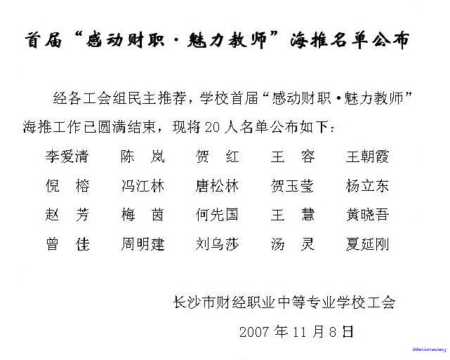 为庆祝党的十七大胜利召开,深入开展文明创建活动,积极配合市委宣传部、市教育局等八单位联合开展的首届长沙市“感动星城?十大魅力教师”评选活动,工作者恪尽职守、为人师表、传承文明、献身教育的精神风貌和人格魅力,引导和激励全体教师和教育工作者为促进学校又好又快发展和构建和谐校园、和谐长沙建功立业,进一步营造全社会尊师重教的氛围,由财职工会组织的首届“感动财职·魅力教师”评选活动已在全校全面铺开,继上个月全校性的宣传发动工作后,11月7日,全校教职员工集体推荐活动也如火如荼的进行。充分展示“省示范性中等职业学校”广大教师和教育