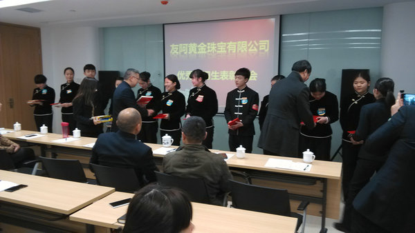 友阿集团是我校校企合作订单班企业之一,友阿黄金珠宝有限公司为友阿集团下属子公司,今年9月位于中山路的第一家国货陈列馆正式开业。我校在该企业实习的学生共有65名,分别在收银、黄金销售、增值服务处、安保部等岗位实习,占该企业新招员工的一半。在实习期间,同学们在各自的岗位上认真学习,努力工作,迅速适应了岗位要求,并逐步能独立工作。企业为了对学生进行表彰激励,特意在年底为我校实习生举行专题表彰会。