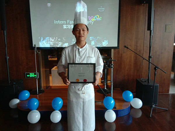在会上,人事总监刘总通过PPT的形式向在座的实习生展示了10个月实习过程中同学们在酒店的点点滴滴,分享了10个月来与实习生相处的体会与感受,感谢了财经实习生10个月来对酒店的无私付出,感谢了学校与酒店合作过程中对酒店工作的大力支持,同时对学校能培养出这么优秀的学生给予了高度的赞扬。在这13名实习生中1532班裴宇喆和1531班阳星被评为优秀实习生,其中裴宇喆代表实习生上台分享了自己10个月实习的心得体会,讲叙了他自己这10个月实习是怎样坚持,遇到困难自我解决,当想要放弃的时候自我调节的心路历程。