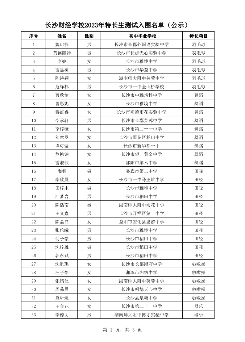 2023年特长生测试入围名单(公示)